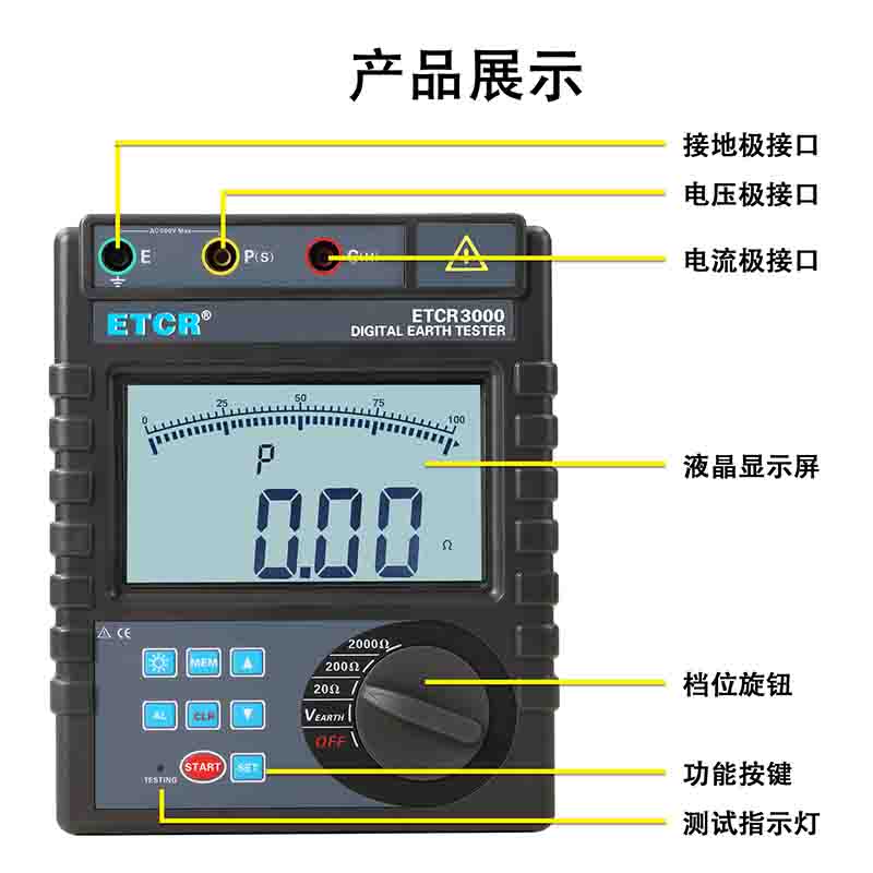 ETCR3000C數(shù)字式接地電阻測試儀0.01Ω~2000Ω——AC 0V~600V可設(shè)置報警閾值400組——
