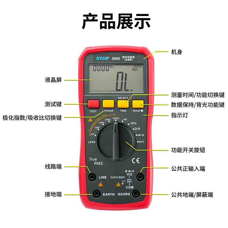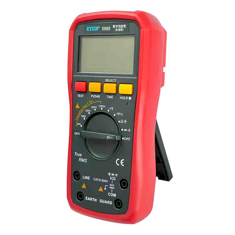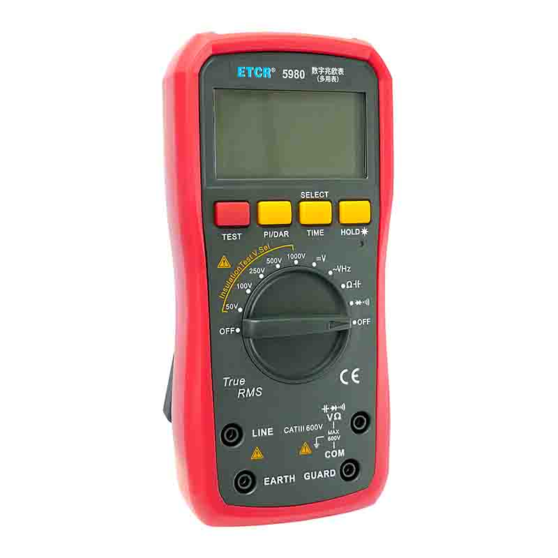 ETCR5980數(shù)字兆歐表(多用表)是一款數(shù)字式兆歐表+數(shù)字萬用表。絕緣電阻測試電壓可選50V/100V/250V/500V/1000V。它可適時監(jiān)測絕緣電阻測試電壓,有效避免因輸出電壓不符合額定值要求而造成的誤判。儀表絕緣電阻測量最高可達到20GΩ,可根據(jù)需要設(shè)置測量時間,測量完畢后自動保持測量結(jié)果。數(shù)字多用表功能有交直流電壓、電阻、電容、頻率、二極管及通斷測量等。本產(chǎn)品適用于測量變壓器、電機、電纜、開關(guān)、電器等各種電氣設(shè)備及絕緣材料的絕緣電阻,對各種電氣設(shè)備進行保養(yǎng)維修、試驗及檢定。它結(jié)構(gòu)精巧,攜帶方便,是您理想的電工、電子測試儀表。
