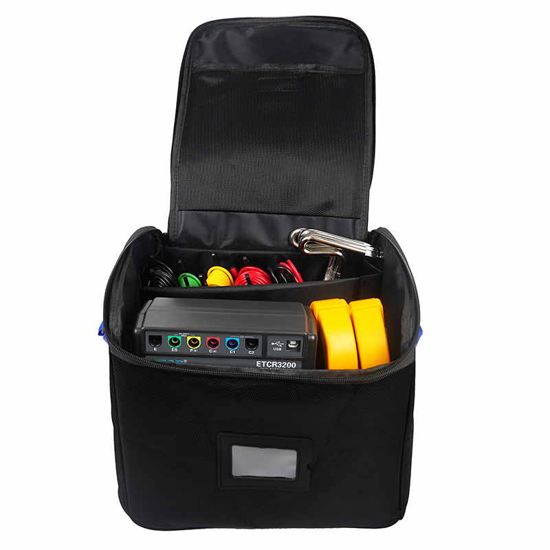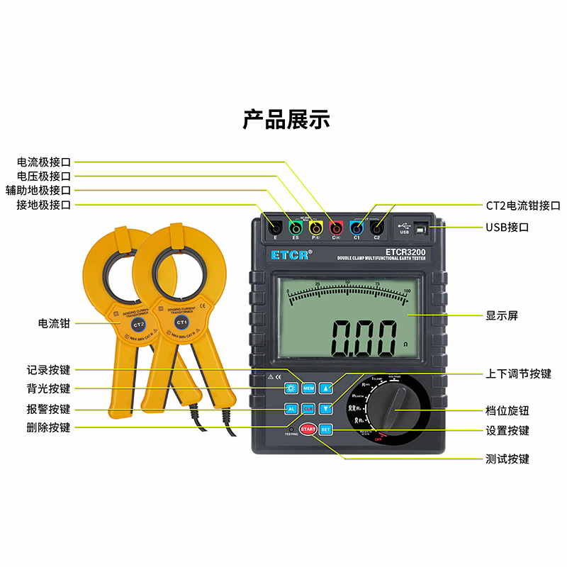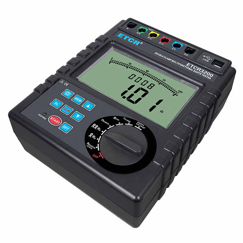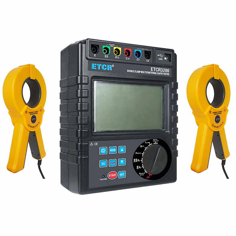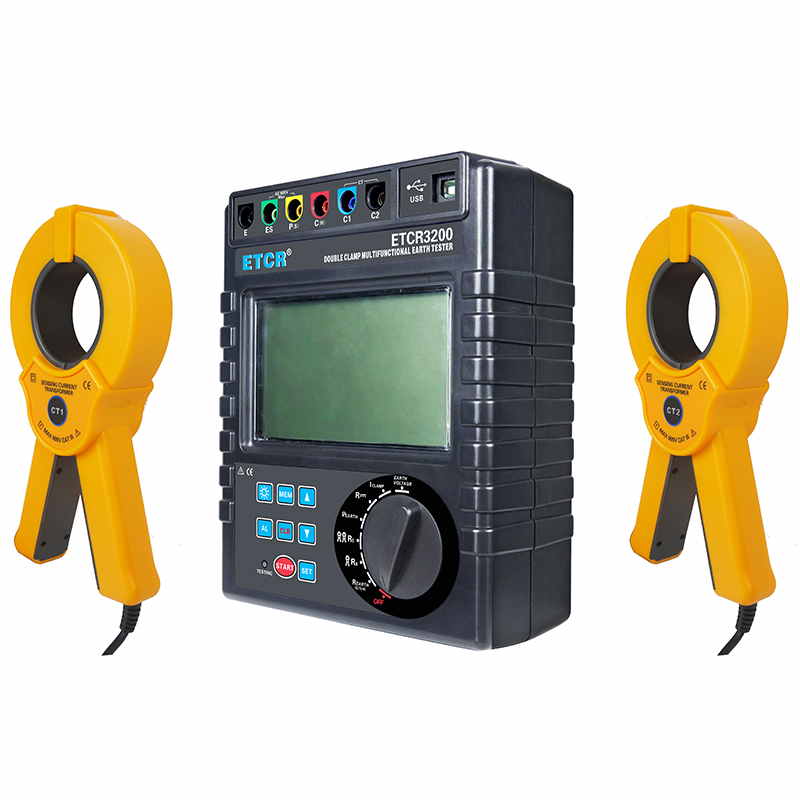 ETCR3200雙鉗接地電阻測試儀,由主機、電流鉗(雙鉗)、數(shù)據(jù)軟件、測試線、輔助接地棒、通訊線等組成。主機超大LCD顯示,具有背光、棒圖指示,一目了然。同時能存儲2000組數(shù)據(jù),通過USB接口數(shù)據(jù)軟件可以實現(xiàn)歷史數(shù)據(jù)讀取、查閱、保存、報表、打印等功能。