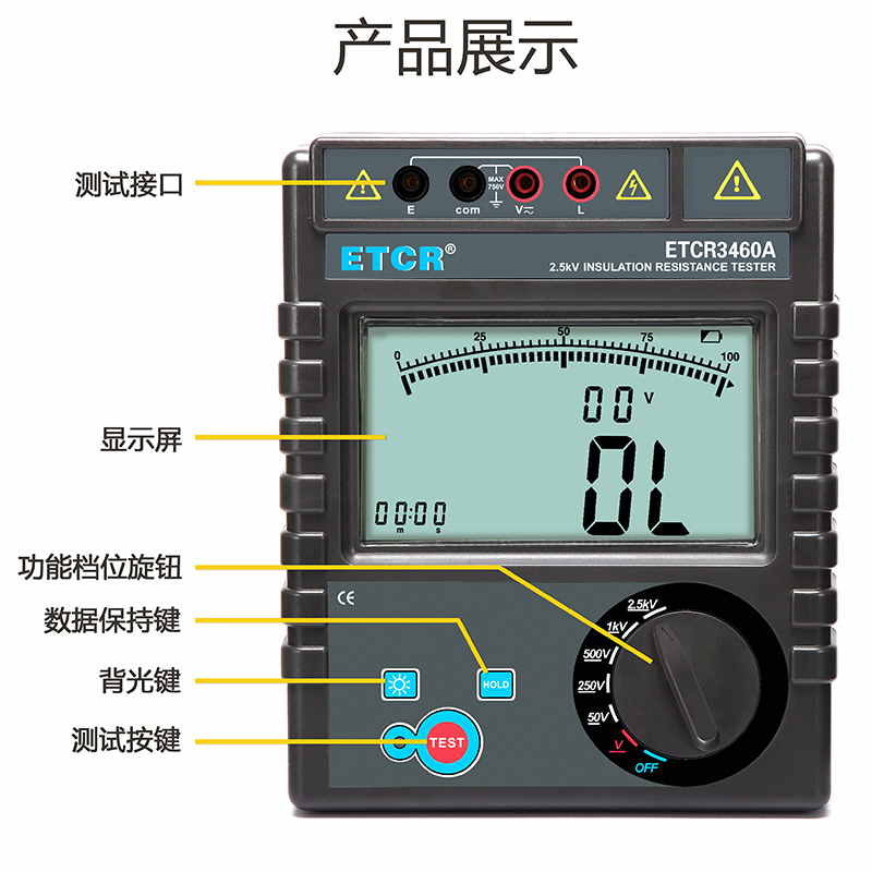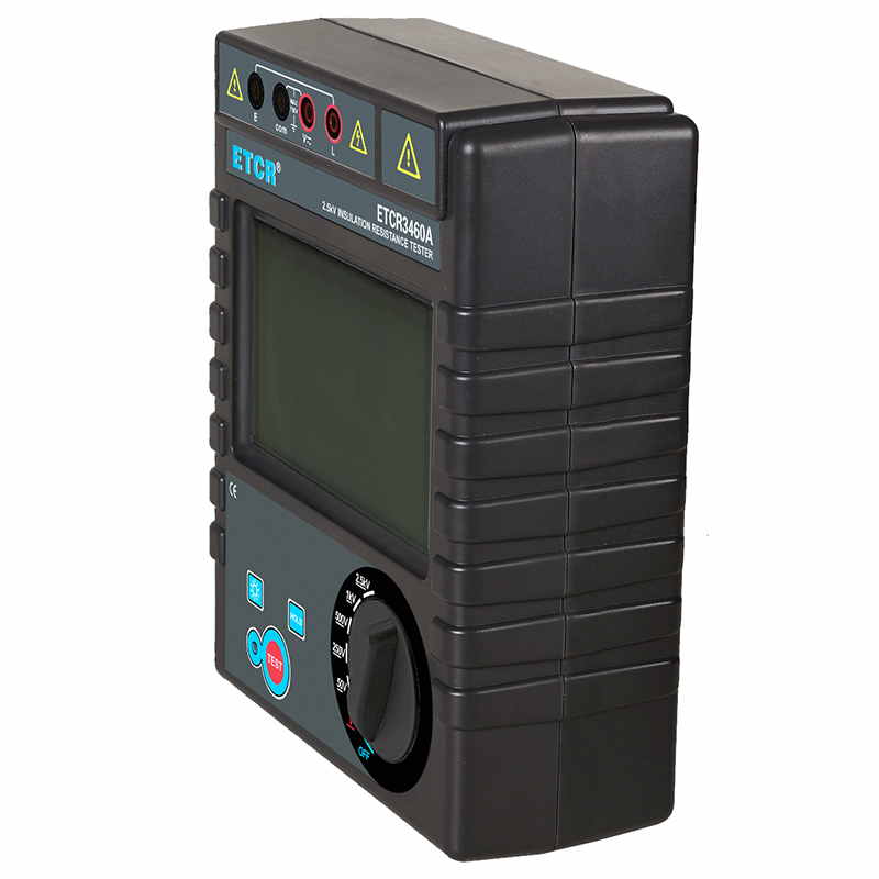 ETCR3460A絕緣電阻表又名兆歐表、絕緣電阻測試儀,用于絕緣電阻測試。儀表具有LCD大屏幕帶背光顯示、數(shù)據(jù)保持、自動放電、自動關(guān)機等功能。儀表具有測試計時,電壓監(jiān)測功能,回路電壓大于36V時,儀表將禁止測試以保護被測物及人員安全。儀表功能操作簡易,絕緣電阻值,測試時間,輸出電壓同屏顯示,具備交流電壓、直流電壓測試功能。