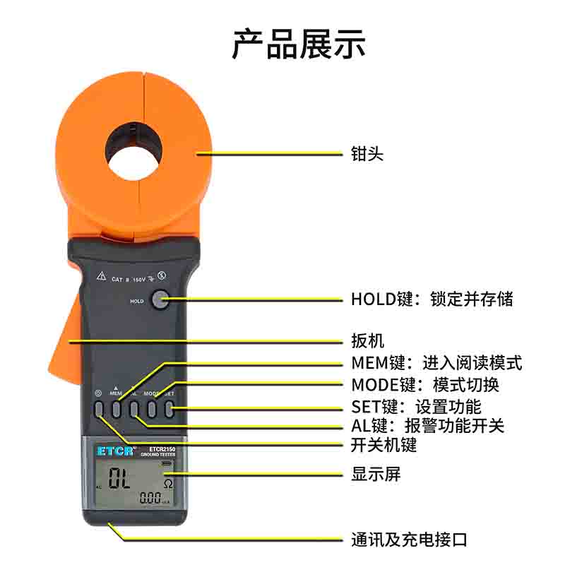 ETCR2150環(huán)路電阻測(cè)試儀電阻、電流、測(cè)試時(shí)間同屏顯示,測(cè)試結(jié)果一目了然。配備可充電鋰電池,使用方便。聲光報(bào)警功能,數(shù)據(jù)存儲(chǔ)、數(shù)據(jù)保持功能。時(shí)鐘功能,顯示當(dāng)前測(cè)試時(shí)間。USB接口數(shù)據(jù)上傳功能。