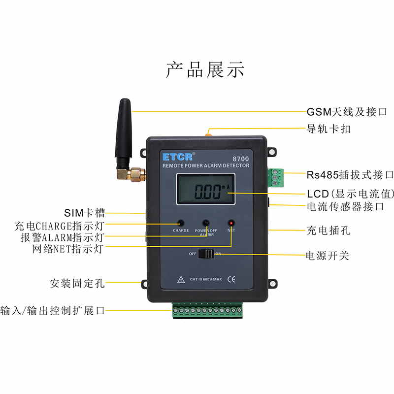 ETCR 8700遠(yuǎn)程斷電/漏電報(bào)警監(jiān)測(cè)儀主機(jī)監(jiān)控1路電流(LCD顯示電流值)、1路外部電源通斷狀況(即供電電源的通斷狀況)、3路擴(kuò)展輸入接口(DC0~9V模擬電壓)、3路擴(kuò)展輸出控制接口(開(kāi)/關(guān):DC12V/0V) ;提供1路RS485數(shù)據(jù)接口及MODBUS協(xié)議,便于二次開(kāi)發(fā);內(nèi)置大容量可充鋰電池,同時(shí)具有充電管理功能,當(dāng)外部供電斷開(kāi)時(shí),內(nèi)置鋰電池繼續(xù)給主機(jī)供電工作,全面實(shí)現(xiàn)遠(yuǎn)程監(jiān)測(cè)、報(bào)警、控制等功能。