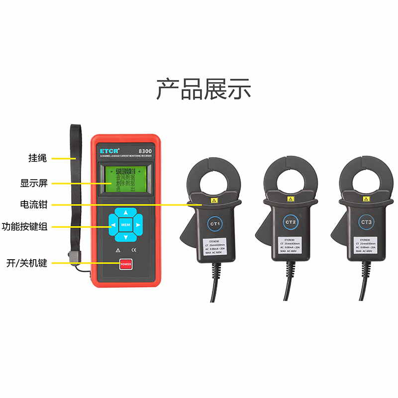 | ETCR8300三路鉗形漏電流記錄儀 | Φ30mm | AC 0.00mA~20A | 7天 | 1秒-99分鐘 | 20萬組 | 鋰電池 | 有 |
