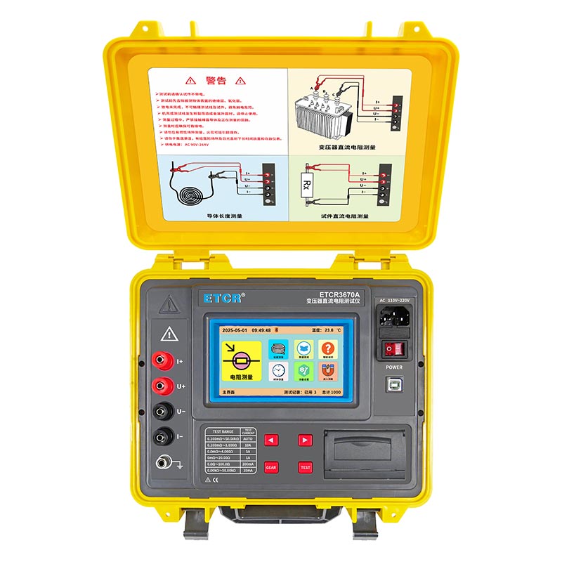 ETCR3670A變壓器直流電阻測(cè)試儀又稱變壓器繞組測(cè)試儀,直流電阻測(cè)試儀,用于快速測(cè)量各種變壓器繞組直流電阻。變壓器制造中半成品、成品出廠試驗(yàn)、安裝、交接試驗(yàn)及電力部門預(yù)防性試驗(yàn)的必測(cè)項(xiàng)目,能有效發(fā)現(xiàn)變壓器線圈的選材、焊接、連接部位松動(dòng)、缺股、斷線等制造缺陷和運(yùn)行后存在的隱患。