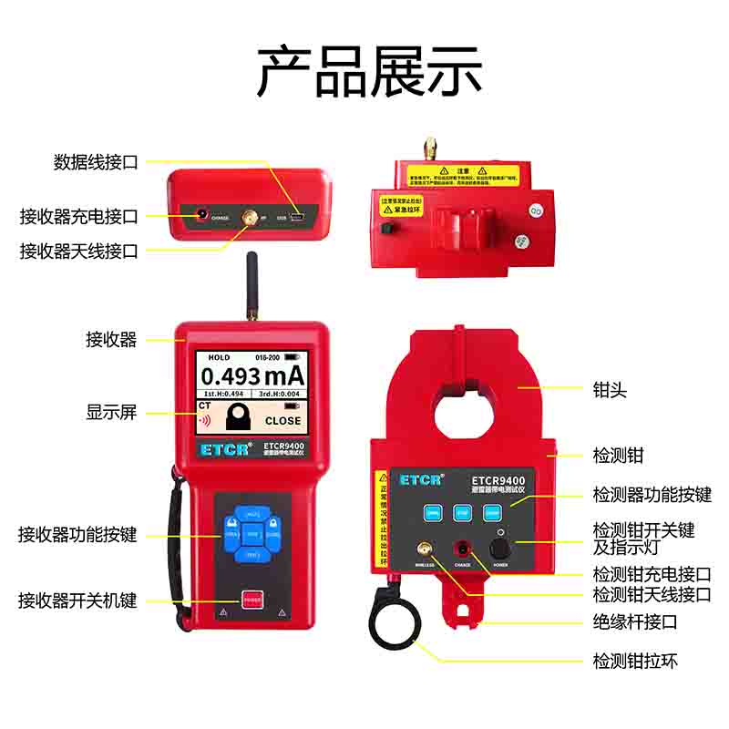 ETCR9400氧化鋅避雷器鉗形帶電測試儀由主機(jī)、檢測儀、絕緣桿組成。主機(jī)與檢測儀采用無線通訊,通訊距離30米,主機(jī)可遙控檢測儀鉗頭的張開或閉合完成測試過程,主機(jī)能實時顯示電流測試值及鉗頭狀況。檢測儀采用微型馬達(dá)驅(qū)動鉗頭的張開或閉合,鉗頭采用高性能坡莫合金制作,具有超強的抗干擾能力,幾乎不受外部磁場的影響,分辨率高達(dá)1uA。檢測儀可連接絕緣桿用于高壓線路的氧化鋅避雷器測試。儀表也可做超高精度鉗形漏電流表使用。儀表還具有數(shù)據(jù)保持、數(shù)據(jù)存儲功能,配有USB接口,存儲數(shù)據(jù)可上傳電腦。