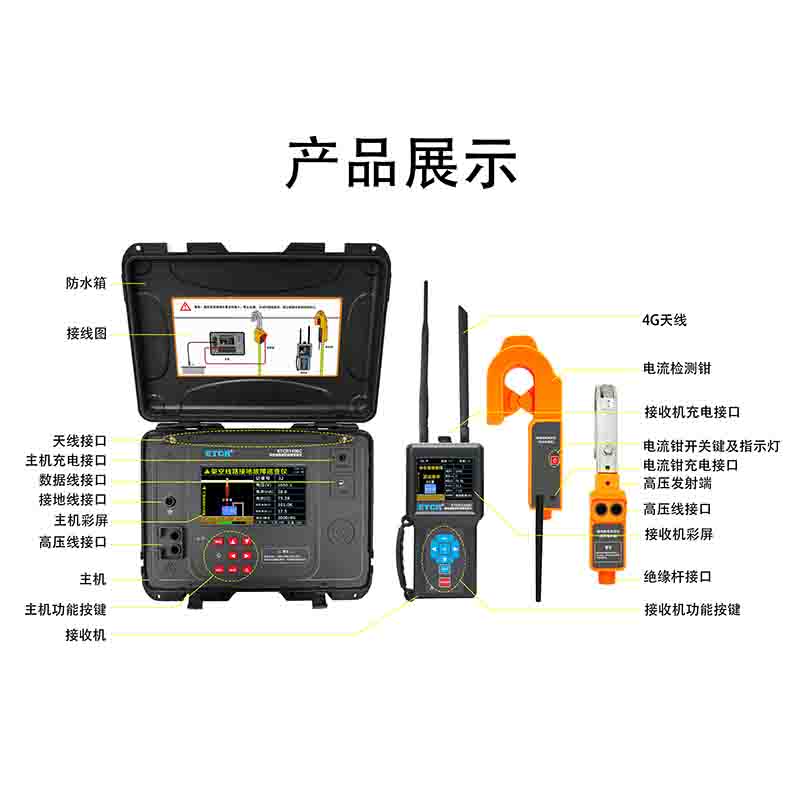 ETCR1400C架空線路接地故障巡查儀,由主機(jī)、電流檢測鉗、高壓發(fā)射端、接收機(jī)、測試線、接地針、絕緣桿及附件組成。主機(jī)與接收器之間為4G/LORA雙模通信,控制高壓信號輸出,同時將測試結(jié)果發(fā)出到主機(jī)。電流鉗與接收器之間為LORA通信,將電流鉗檢測到的信號發(fā)送到接收器。主機(jī)采用7寸彩屏,故障指向清晰明了,測試結(jié)果一目了然,接收機(jī)具有語音播報功能,測試結(jié)果、線路故障方向,使得現(xiàn)場操作更加輕松。電流檢測鉗及高壓發(fā)射端結(jié)構(gòu)緊湊,體積小,重量輕,掛裝方便,一次掛裝即可完成線路故障查找,操作簡易快速,極大減輕了測試的工作強(qiáng)度,提高工作效率。